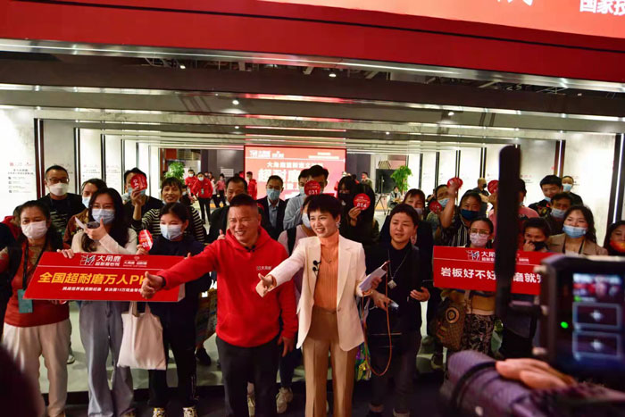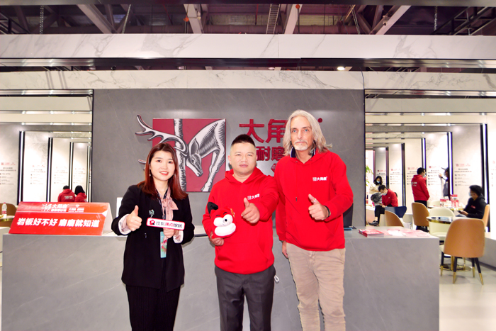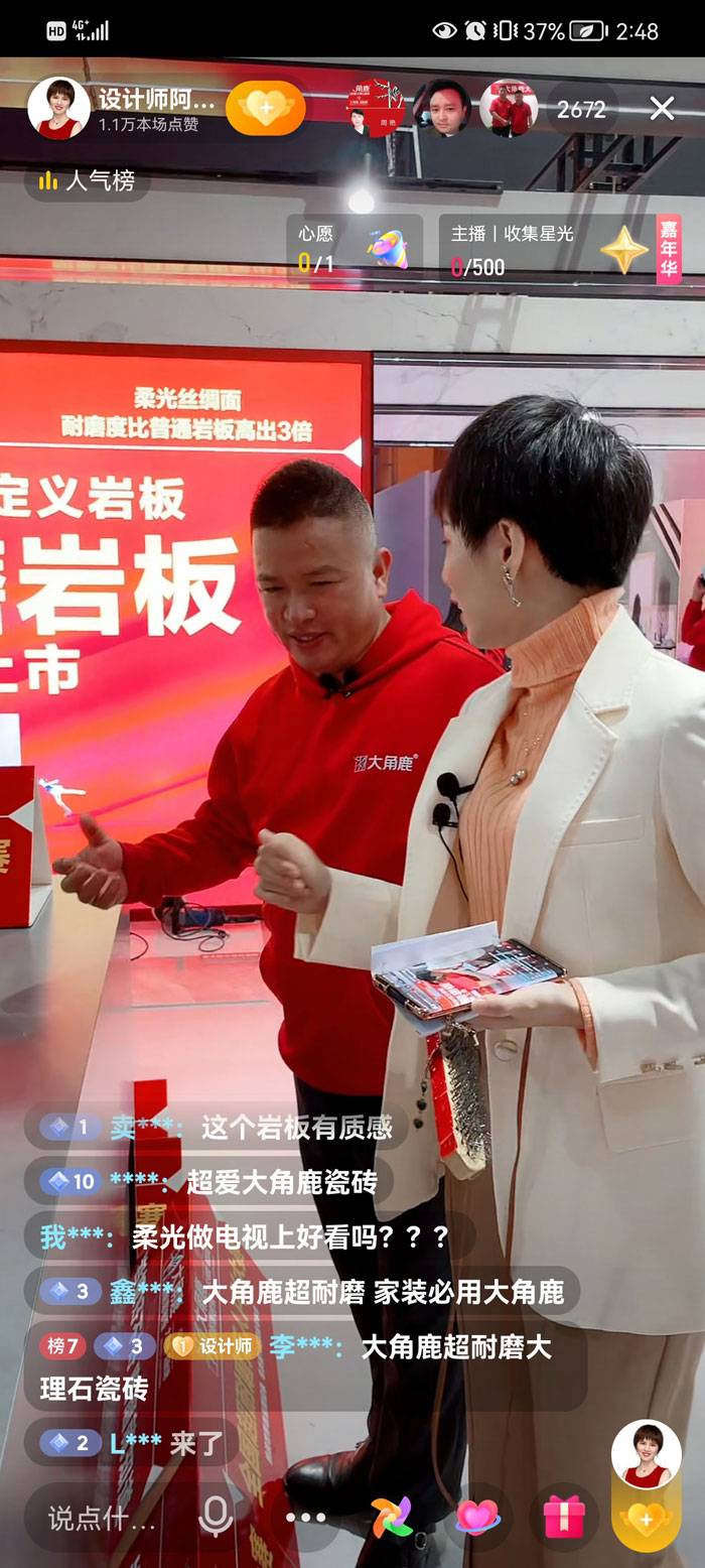 设计师阿爽走进广州设计周,以专业角度教大家如何挑选岩板,大角鹿凭借超耐磨卓越品质成功吸引了设计师阿爽。大角鹿创始人南顺芝和大角鹿产品设计总监、意大利著名设计师罗伯特受邀出席阿爽直播间,与设计师阿爽全网3000多万粉丝分享如何挑选岩板以及与观众共同见证大角鹿超耐磨是如何炼成的。同时,新浪家居、腾讯家居、抖音、百度、快手、天猫、陶瓷资讯、视频号等8大平台同步直播。现场人气非常火爆,吸引了来自全国各地的设计师围观。