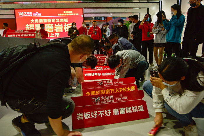 大角鹿走到哪火到哪,这次虽然是第一次参加广州设计周,但是大角鹿全国超耐磨万人pk大赛·广州设计周站人气依然火爆,每场活动都是被“人海”包围,逛展的设计师拿起钢刷用力磨大角鹿超耐磨岩板,亲自体验大角鹿超耐磨的品质。截止到目前,大角鹿已在全国238个城市,举办了1800多场超耐磨万人PK大赛,累计超90000人参与、540000人现场共同见证,共发放奖金9500000元。