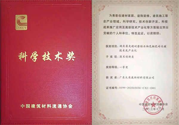 中国瓷砖增长王大角鹿凭借引领全球的超耐磨技术和强大的品牌影响力,一举荣获“2023年度中国建材与家居行业科学技术奖·技术创新类一等奖”和“2023全国绿色建材下乡推进工作·推荐优秀案例”2大奖项。