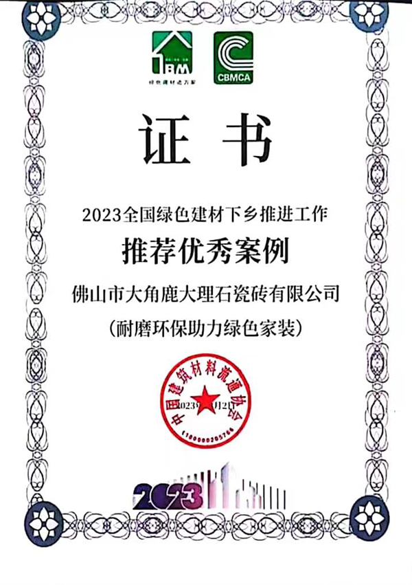 大角鹿多年来一直积极响应国家绿色节能发展战略,将“绿色低碳”贯穿生产服务全过程。在大会上,大角鹿以“耐磨环保助力绿色家装”荣获“2023全国绿色建材下乡推进工作推荐优秀案例”。