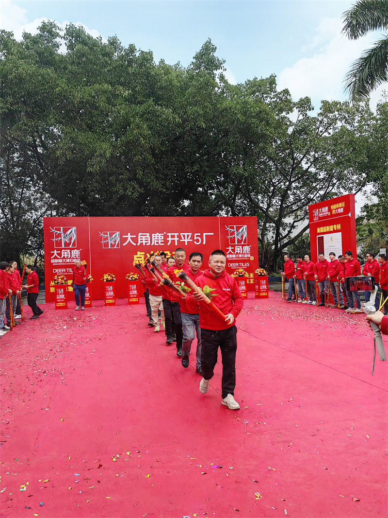 红红火火 产销两旺!在熊熊炉火和鞭炮声中,大角鹿开平5厂正式点火投产。大角鹿创始人南顺芝鼓励全体员工全力以赴,努力奋斗,让大角鹿瓷砖从中国增长王到全球增长王。