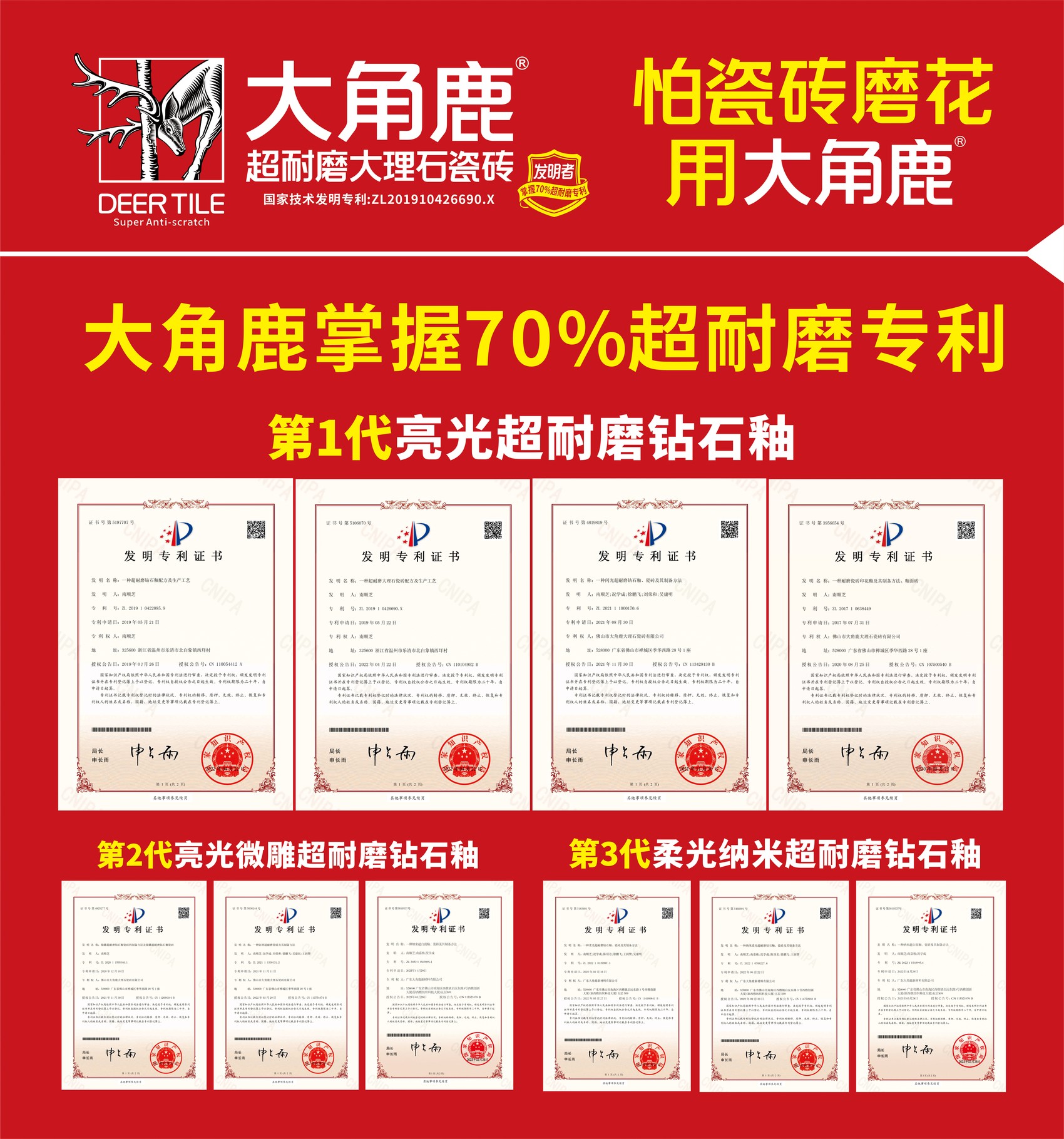 从研发生产第1代超耐磨大理石瓷砖,把瓷砖耐磨度提高到普通瓷砖的3倍以上;到第2代微雕超耐磨钻石釉技术,使瓷砖耐磨指数全面提升到6000转以上,防滑性能达到A级;再到集结了“柔光肌肤”与超耐磨钻石釉技术的第3代大角鹿超耐磨柔光砖问世,每一个技术突破都离不开大角鹿对创新的追求,对提高产品质量的执着,同时也刷新了业界对瓷砖耐磨度的认知。