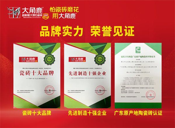 大角鹿作为“超耐磨大理石瓷砖发明者”,拥有超七成超耐磨国家发明专利技术,是耐磨度全球第一和超耐磨发明专利数量第一的瓷砖品牌。同时,大角鹿也是首批上榜“佛山陶瓷”商标授权品牌,凭借其六大生产基地卓越的制造实力,向广大消费者展现了正宗广东砖的高标准水平。