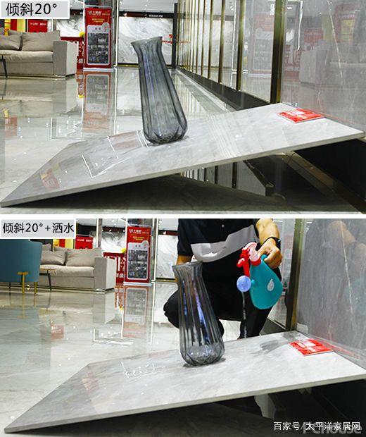 在防滑测试中,评测人员将瓷砖的砖面倾斜度调整至20°左右,在上面放上花瓶。在光洁的瓷砖上,花瓶并无滑落迹象;接着,现场测评人员,在瓷砖的表面洒上水,模仿家里地面有水的情况出现,但瓷砖表面的花瓶始终不动。