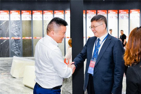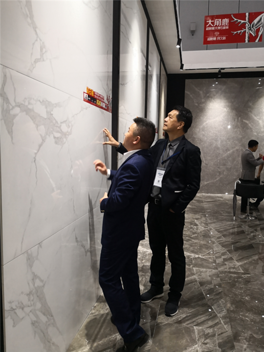 中国国际经济技术合作促进会理事长杨春光在大角鹿董事长南顺芝的陪同下参观了大角鹿展馆,并大赞大角鹿超耐磨大理石瓷砖。