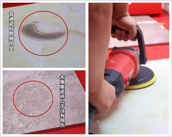 装修专用打磨机的硬度跟金刚石差不多,机器开动,现场就能闻到高强度摩擦砖后产生的特殊异味,普通瓷砖很快就被磨掉釉面,留下深深的痕迹;然而,大角鹿超耐磨大理石瓷砖在重磨之下几乎没有损伤。活动结束,面对这样对比明显的结果和亲身实践,围观人群无一不夸赞大角鹿超耐磨大理石瓷砖货真价实,超耐磨度惊人,今后装修一定会首选大角鹿超耐磨大理石瓷砖。