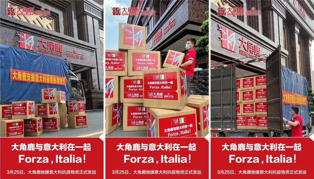 帮助意大利渡过难关,大角鹿在行动。随着疫情的扩散,意大利当地医疗物资供不应求,形势十分紧张。在如此危难时刻,大角鹿第一时间为意大利伙伴筹集了大量医疗物资。据悉,经过大角鹿全公司的紧急筹备,3月25日当天大角鹿驰援意大利抗疫的大批物资,承载着大角鹿全体员工对意大利的祝福已经正式装车发往意大利。
